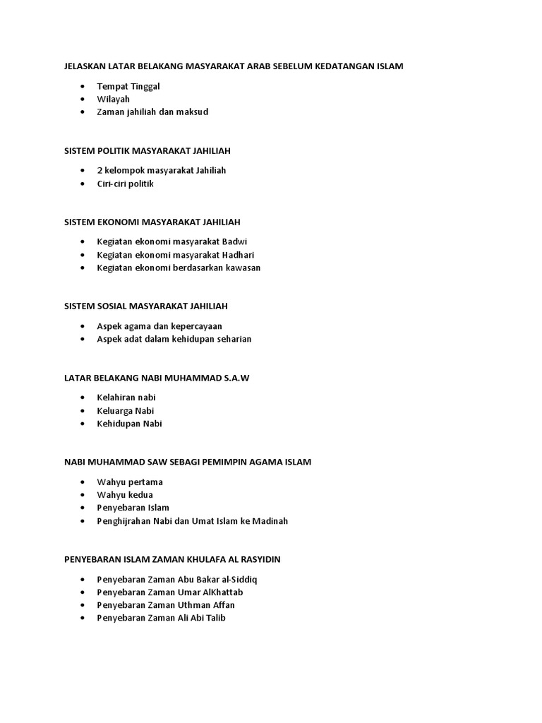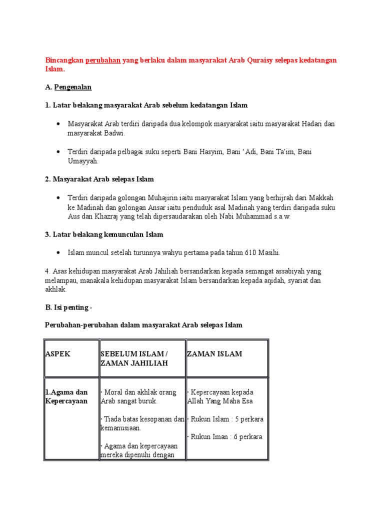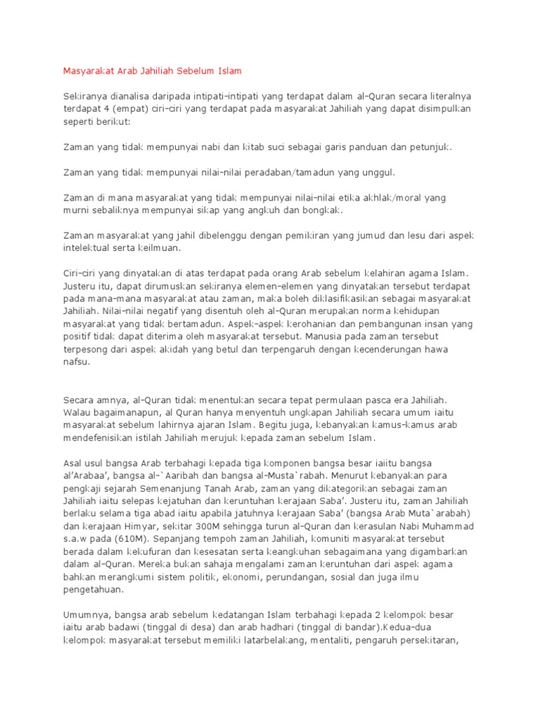 Masyarakat arab sebelum kedatangan islam dalam hal ini adalah islam yang disempurnakan nabi muhammad saw dikenal sebagai masyarakat jahiliyah masyarakat arab pada saat itu melakukan kegiatan ekonomi dengan cara berdagang. F1 sejarah bab 8 tamadun islam dan sumbangannya f1 sejarah bab 8.1 latar belakang masyarakat arab sebelum kedatangan islam. Islam untuk keluarga nabi muhamad. Periode jahiliyah ini dalam islam, adalah masa yang tidak mengenal agama tauhid yang membuat moralitas mereka menjadi minim. Beliau amat terkenal dengan sikapnya yang ringan tulang, senang membantu serta berbuat kebajikan kepada masyarakat sekeliling.